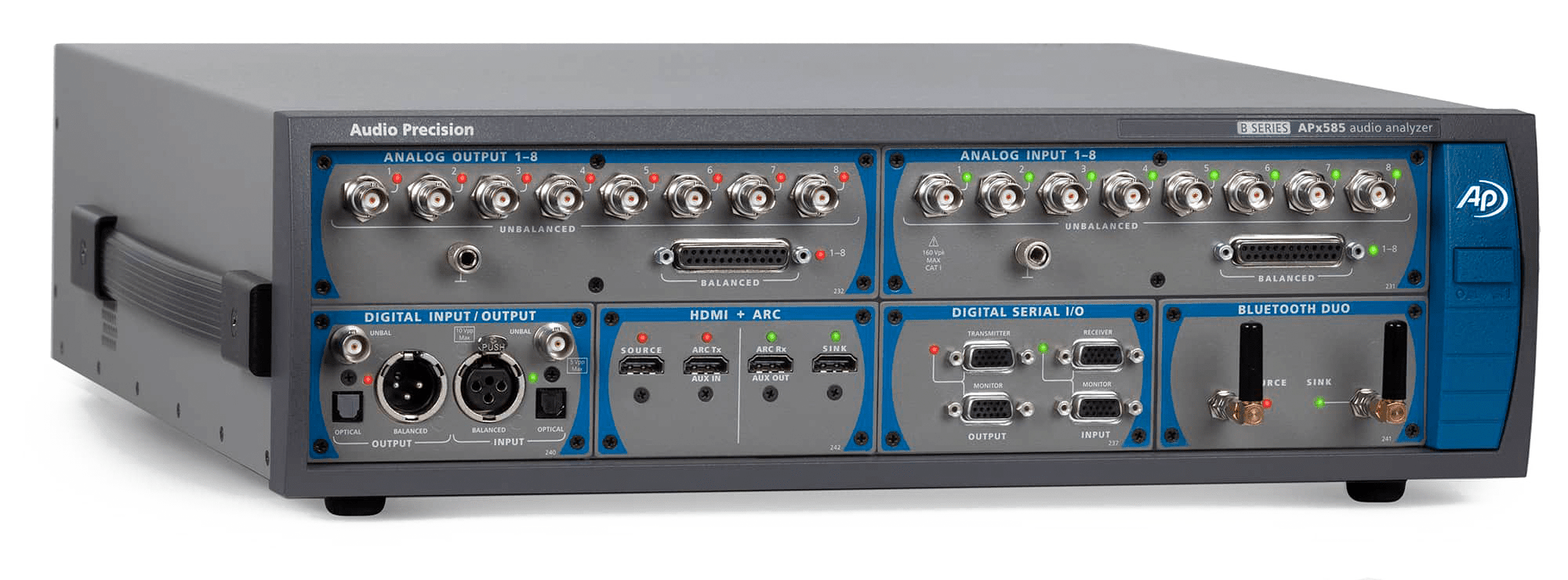 All APx58x B Series analyzers have up to 216k digital inputs and outputs via AES/EBU, TOSLINK and SPDIF. Additionally, I/O may be expanded with optional Digital Serial, HDMI with ARC, PDM and Bluetooth modules.