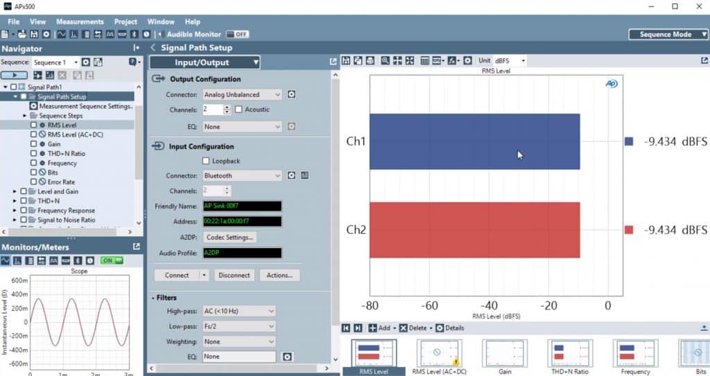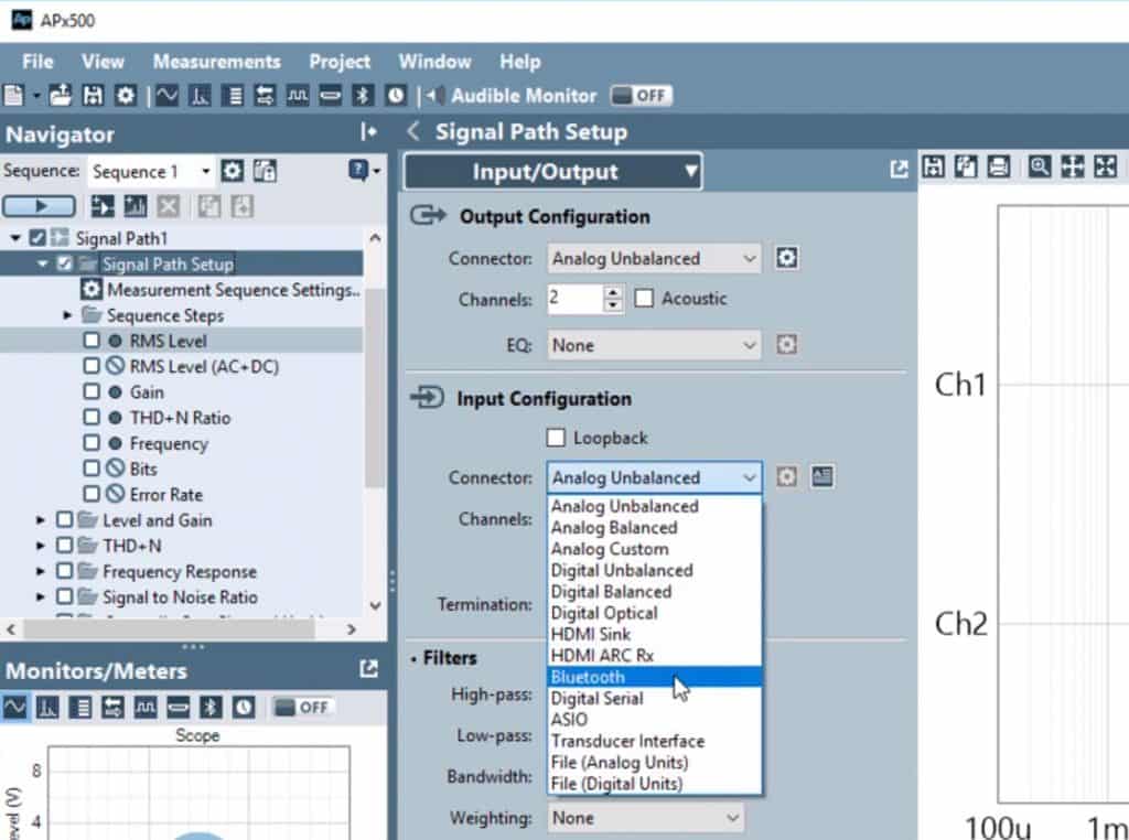 - 1. Open APx500 software and locate “Signal Path Setup – Input/Output” and select “Bluetooth” as the analyzer output or input. For purposes of this post, we will select “Bluetooth” as the analyzer input.