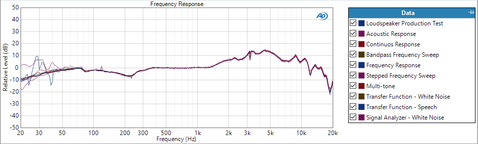 On measurement speed – For finding just the frequency response of a typical device, likely no technique is faster than the chirp embodied in Frequency Response, Acoustic Response, Continuous Sweep, and Loudspeaker Production Test. Multitone is the second fastest technique which need only be 100 milliseconds or so slower than a chirp. Stepped Frequency Sweep, Bandpass Frequency Sweep, Transfer Function, and Signal Analyzer will be the slowest measurement techniques.